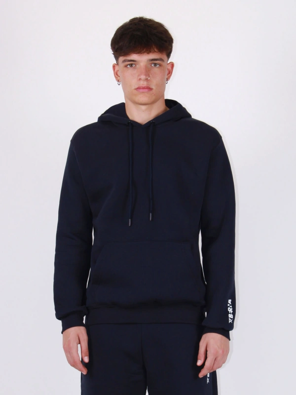 Basic long-sleeved hoodie in a cotton blend. Flag logo applique on the side. Front kangaroo pocket and adjustable drawstring. Large logo print on the left arm. Straight hem with ribbed cuffs and trim.